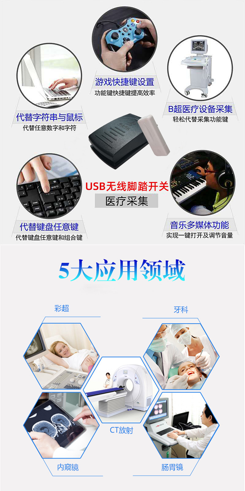 2.4G無線USB腳踏開關,擺脫了傳統的有線纏繞。有一位和多位可選。